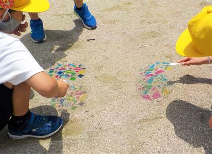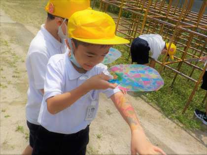 今日は太陽の光がいっぱいだったので、図画工作科で作った「光のプレゼントうちわ」をもってグラウンドへ行きました。「わぁ〜きれい〜」「地面に近づけるとはっきり見えるよ」と楽しんでいる様子でした。地面だけでなく、腕や足、友達の背中など、いろいろなところに光のプレゼントを届けている子どもたちでした。