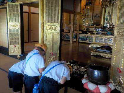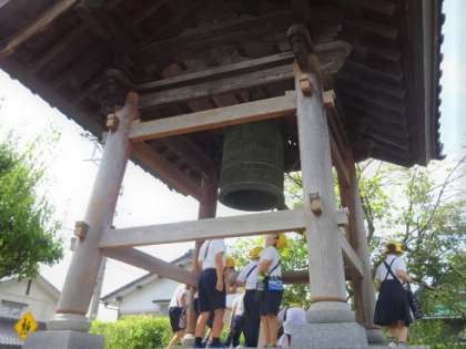 「さくらだに たんけんたい」は、石坂へ探検に行きました。はじめに着いたのは、お寺です。大きな鐘や、金色の仏様などがありました。初めて見るものばかりだったので、目を輝かせながら見ていました。お寺の方への「おはようございます」「おじゃまします」などのあいさつも元気がよく、すてきでした。