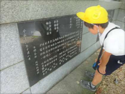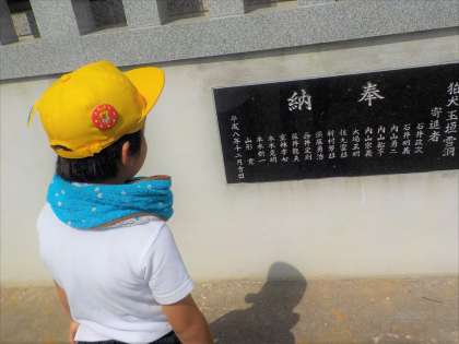 次に神社へ行きました。何度も訪れたことのある子どもが多くいましたが、今日改めて発見することもあったようです。「犬の口が、あいているのとあいていなのがあったよ」「たくさん名前が書いてあったよ。なんでかな」などと話していました。