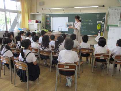 朝のおはなし会がありました。子供たちは、この時間をとても楽しみにしています。今日は、今の時期にぴったりのプールにまつわるお話を読んでいただきました。また、高知県に伝わるお話を何も見ないで読んでくださった地域の方に、子供たちは「え!見ないで読んでてすごい!」とびっくりしていました。もっともっと読んでもらいたいという声が聞かれました。