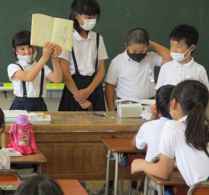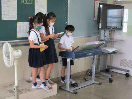 自分達で企画した係の発表を頑張っています。写真は、クイズ・ピアノ係、飾り・折り紙、本係の様子です。それぞれの係で工夫をして取り組んでいます。