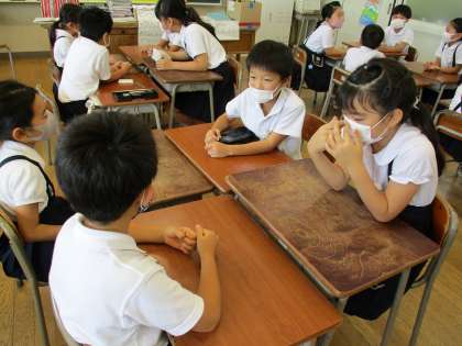 今日は夏休みの思い出をグループごとに話をしました。興味津々に友達の話を聞き合っていました。