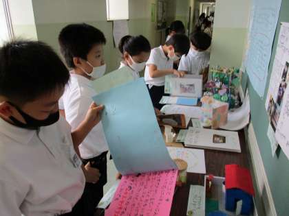 他学年の自由研究も参観しました。たくさんの作品を見て、自分と似ているところや違いを見付けながらみていました。