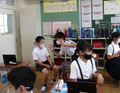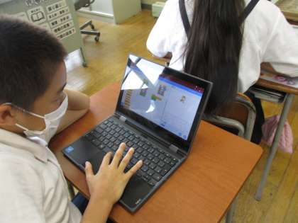「拡大図と縮図」を学習しています。プログラミングで拡大図や縮図をかくために、今日はスクラッチでのプログラミングに親しみました。友達とプログラミングを体で体験したあと、プログラムを組み立てながら正多角形を作ることができました。