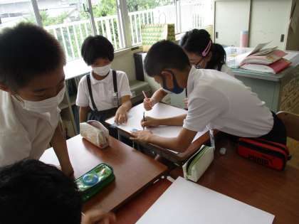 他学年と交流が難しい時期であるので、1〜5年生も楽しく遊べる遊びを6年生が手作りしています。遊びを通じて間接的ではあるけれど、下級生とつながることができるといいなという思いからです。みんないきいきした表情でおもちゃの計画を立てて準備をしていました。