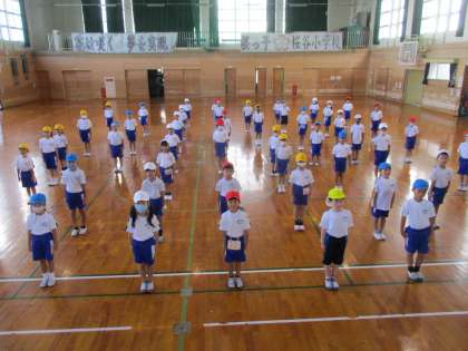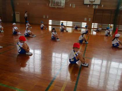 体育ではマスクを外すため、友達とのソーシャルディスタンスを保って並ぶ練習をしています。「距離を取る」「お話はマスクで」が徐々に身に付いてきました。