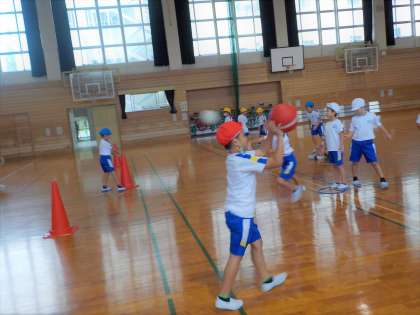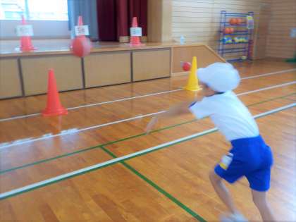 ボールを投げて、カラーコーンを倒しました。ねらいを定めて、投げることができました。