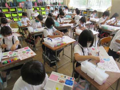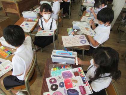 今日は小学校で初めての水彩絵の具を使いました。最初は、色を決めてみんなで同じ色を作りましたが、それぞれが好きな色を混ぜたり、どんな色ができるか試したり、みんないろんな色を作ることができてうれしそうでした。
