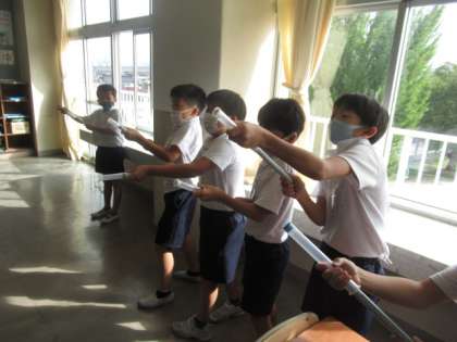 空気鉄砲を使い、「なぜ空気鉄砲の弾はとぶのだろうか?」という学習課題の解決に向けて実験を行いました。