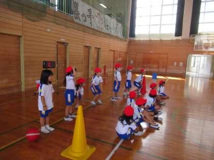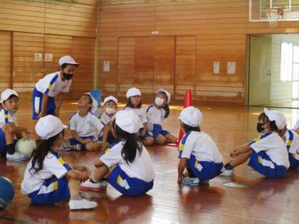 体育のボール運動では、前回に引き続き的を狙って投げたり、団で競ったりして活動しました。得点が一番多かった団に、「どのようにすれば、得点が多くなるか」を聞いている姿から、次は負けないぞという気持ちが伝わります。