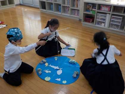 先週完成した「桜っコーナー」に今日から1〜5年生がやってきました。6年生はみんなが楽しく遊んでくれているか気になる様子。使い方が分からない1年生にも声を掛けてあげていました。