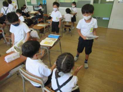 おむすびころりんの音読発表会では、自分たちでお気に入りの場面を決めて発表しました。発表する際には、「大きな声で言いたい!」「はっきりした声でいいたい」など気をつけたいことを話している様子から、一生懸命取り組んでいるように感じます。