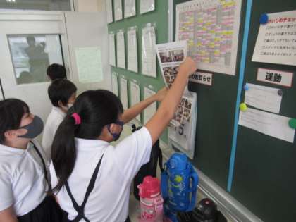 2学期から、「4年1組カレンダー」を掲示しました。カレンダーには前日の日付や、ホームページに載せきれない前日の写真を載せており、前日にどのような学習や生活をしたのかを子供たち自身で振り返ることができるようにしてあります。