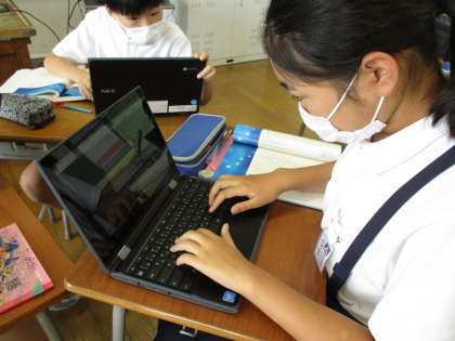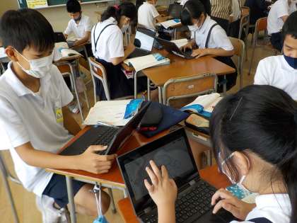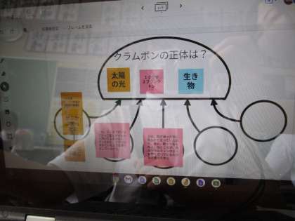 国語では「やまなし」の学習を始めています。宮沢賢治の描く世界に、不思議な物語だな、謎が多いなという印象を受けた子供たちです。グループに分かれ、設定した3つの課題について考え、「やまなし」を読んでいきます。自分たちが使いたい思考ツールを選びながら根拠を整理していました。