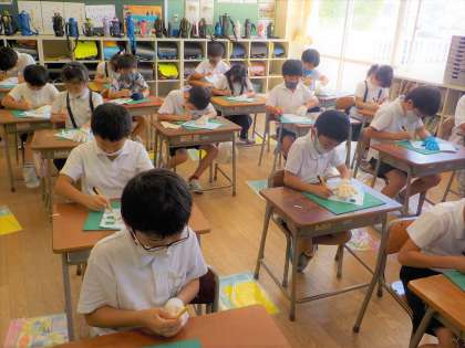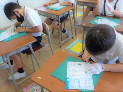図画工作科では「まどからこんにちは」の学習をはじめました。今日は、まどをつくるために使うカッターの使い方を練習しました。力加減や手の動かし方など、最初はうまくいかない様子でしたが、練習を重ねていくうちにコツをつかんでいました。