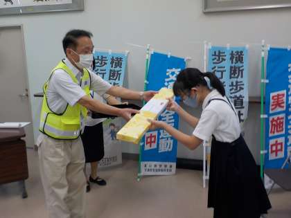 桜谷支部長の田中様から、児童代表に傘が手渡されました。反射材付きの傘は、子供たちの安全を守ってくれることでしょう。桜っ子全員、同じ傘を持っているので、名前をきちんと書いておいてくださいね。