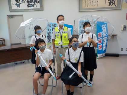 交通安全協会からいただいた傘の贈呈式を行いました。