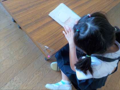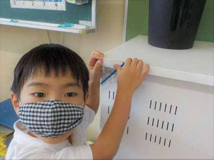 今日は、直角の学習をしました。自分たちの作った直角が三角定規にもあることに気づき、三角定規をもって直角探しの旅に行きました。いろいろな場所に直角があることに気づいた子どもたちでした。