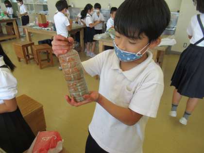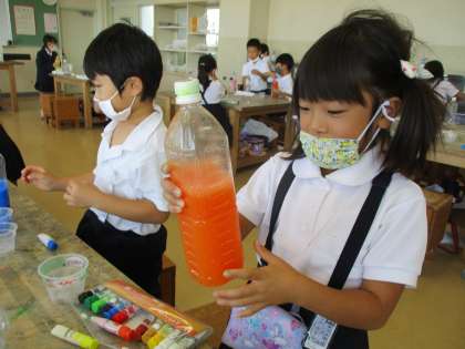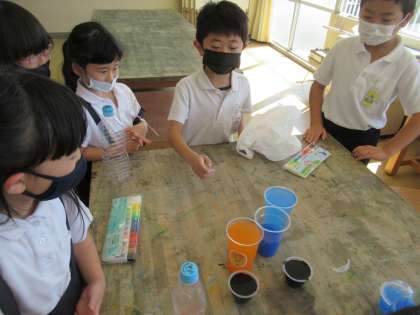 図画工作科では、絵の具と水を使って色水作りをしました。初めての体験に、子供たちははやくやりたくて月曜日から待ち遠しく思っていたみたいです。