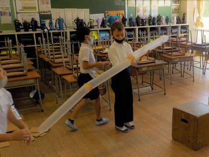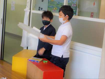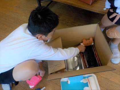 おもちゃづくりの様子です。じっくり集中して作ったり、友達と相談をしながら作ったりと、様々な子供の姿が見られました。