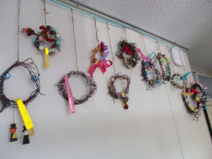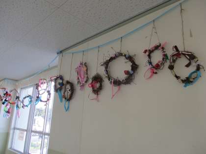 出来上がったあさがおのリースは、壁に飾っています。思い思いの飾りを付けたリースは、どれもとても素敵です。来月まで廊下に飾ったあとは、家に持ち帰る予定です。楽しみにしていてくださいね。