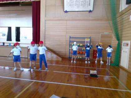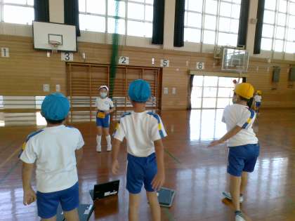 リズムダンスに取り組んでいる3年生です。自分達で曲を決め、チーム名も決めました。5つのグループに分かれて自分達のオリジナルのダンスを考えています。どのチームも意見を出し合って取り組んでいます。