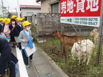 1年生みんなで、近くのみどり町公園へ秋を見つけに行ってきました。道路を歩く際は、「交通ルールを守って安全に」を合い言葉に、車に気を付けて歩くことができました。途中では、なんとヤギに出会い、子供たちはみんな驚きを隠せない様子でした。道を歩いているといろんな発見がありますね。