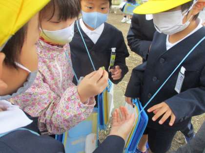 みどり町公園には、たくさんのどんぐりやおなもみ、落ち葉などがあり、秋をたくさん見つけることができました。学校のグラウンドにあるどんぐりよりも大きなどんぐりをたくさん集めることができて嬉しそうな子供たちでした。