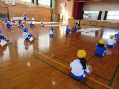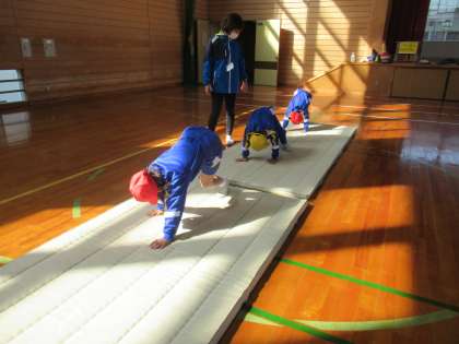 前転、後転をするために、体をマットに慣れさせたり、動きが似ている技をしたり、コツを教えていただきながらがんばっている様子が見られました。また、いろいろな技を練習していきたいですね。