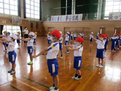 今日の体育は、スポーツ指導員の方が来てくださり、マット運動をしました。小学校では初めてのマット運動でしたが、準備体操をしっかり行い活動に取り組みました。