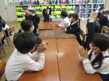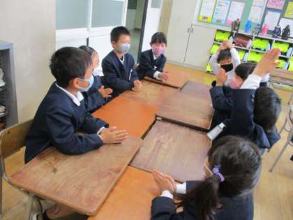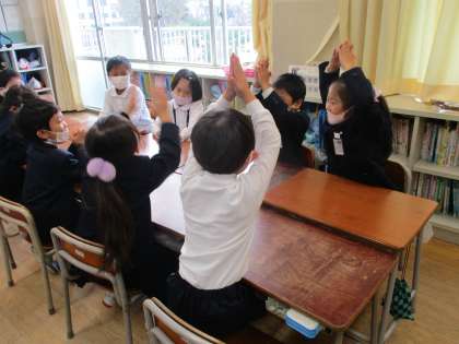 今日のさくらっ子タイムは、集会委員会によるなかよし集会でした。そのときに遊ぶ「たけのこにょっき」ゲームをクラスでもやってみました。まずはグループで試した後、人数を増やして挑戦してみました。最後まで続けるのはなかなか難しく、みんな苦戦していましたが、どのグループもにこにこ笑顔でした。