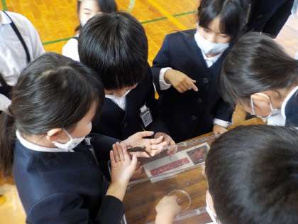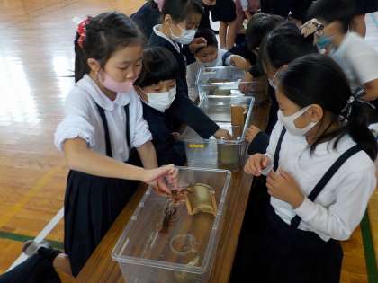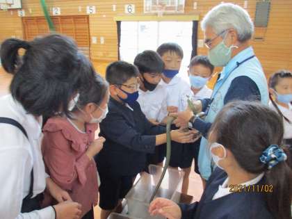 ファミリーパークの方に来ていただき、呉羽丘陵に住んでいる生き物についてお話をしていただきました。子供達が見たことある生き物も紹介されていましたが、約2500種類の生き物が住んでいることを聞いて驚いている3年生でした。実際に生き物も触らせていただきました。貴重な体験をすることができました。
