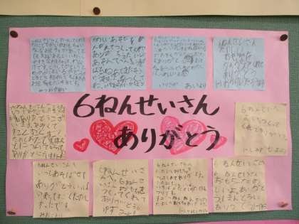1〜5年生のために、休み時間に遊べる用具を手作りした6年生。今日は、そのお礼に1年生が教室にお手紙を持ってきてくれました。1年生の思いのこもった手紙を6年生も嬉しそうに読んでいました。みんなのためにがんばってよかったね。