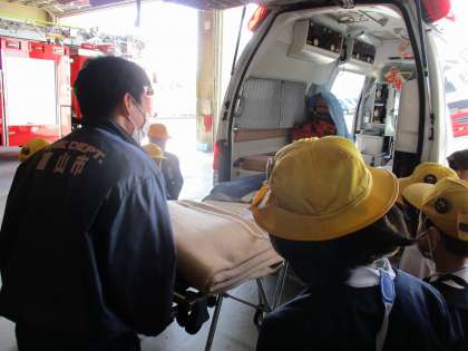 ますのすしミュージアムの後には、富山市消防局に行きました。たくさんの車を一つ一つ見せていただきました。それぞれの車に役割があって、子供達も興味津々に見学をしていました。実際にホースも持たせていただきました。軽いと感じた子、重いと感じた子それぞれでしたが、消防士さんはこれを一度に4つ持たれることを聞いて声を出して驚いている3年生でした。