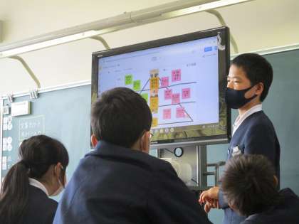 天下統一への働きが最も大きかったのはだれか、3人の武将ランキングを決めました。ジャムボードにランキングを決め、その根拠を書き込みました。みんなそれぞれ大事だと思う政治や戦いの様子があり、友達の意見を興味深く聞いていました。