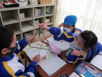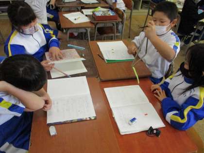 音を出して調べようの学習で、トライアングルを使って実験をしました。音が出ている時にトライアングルや付けた付箋が震えてのを実際に触ったりして感じました。トライアングルを手でつかんだり、大きい音と小さい音を比べてみたりしました。