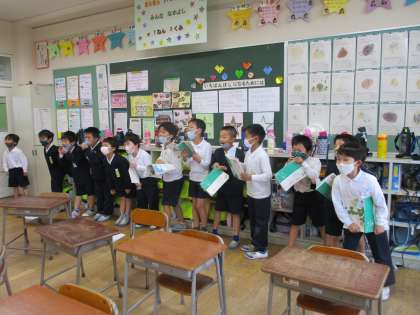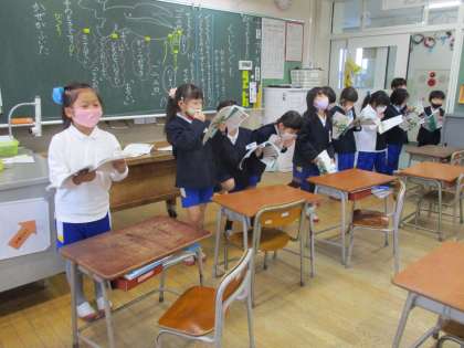 くじらぐもの音読をしている様子です。自分たちで音読の工夫を考えて読んでいます。くじら役と子供たち役に分かれて呼びかけ合っています。「晴れた日にグラウンドへ行ってやりたい!」とやる気満々の子供たちです。
