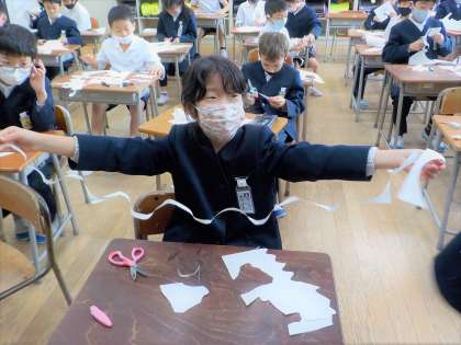 図画工作科の学習の様子です。思いのままにはさみを動かし、偶然できた形から一つの作品をつくっていきます。ぎざぎざやぐるぐる、ぐねぐね等、様々な切り方を楽しみながら活動していました。できた形もスプーンに見えたり、ヘビに見えたりと、見方によって変わるようです。どのような作品ができあがるか楽しみです。