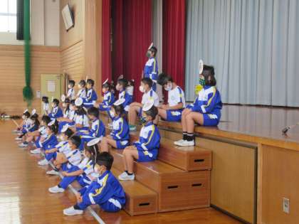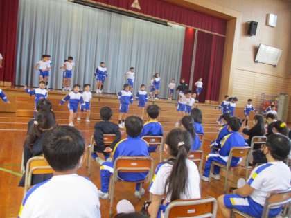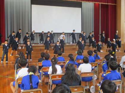 今日は、学びの発表会の発表を1〜3年生で見合いました。トップバッターは1年生。ドキドキして緊張した様子でしたが、いざ舞台に立つとみんな堂々と発表していました。