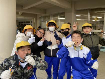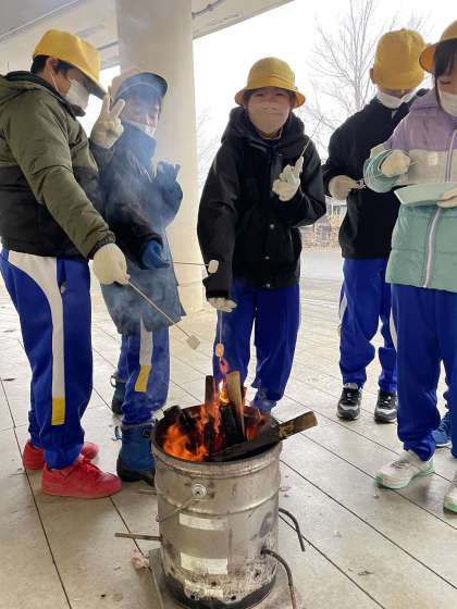 活動3 焚き火でマシュマロアンドサツマイモです。 みんな、いい顔しています。