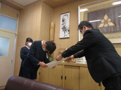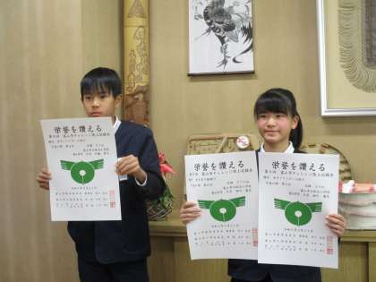 チャレンジ陸上で優秀な成績を修めた2人の受賞伝達を校長室で行いました。おめでとう!