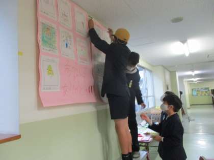 学校を明るくしようと全校に呼びかけたイラスト大会に応募してくれた人の作品を掲示しました。1階廊下に掲示しています。用務員さんのお力も借り、安全に掲示することができました。