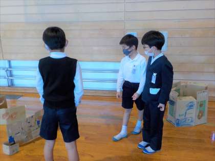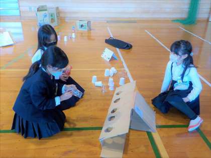 今日は、みんなが作ったうごくおもちゃで、3年生さんに遊んでもらいました。朝から汗をかきながら準備をし、昼休みも必死で準備をしました。本番は、少し緊張しながらも、「いらっしゃいませ〜」「このおもちゃどうですか〜」と声を出していました。