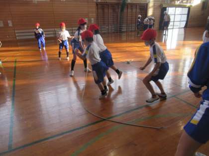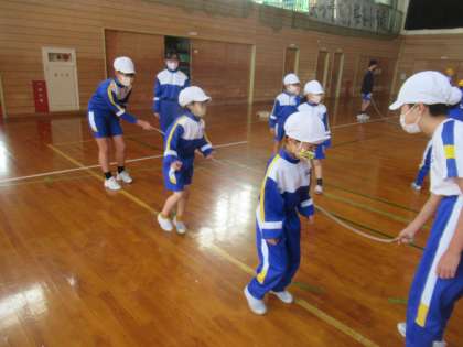 大波小波や、ゆうびんやさんなど、大縄に親しめるように6年生さんが縄を回してくださったり、教えてくださったりしたので、楽しく取り組むことができました。