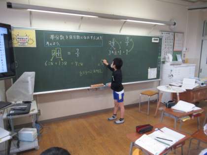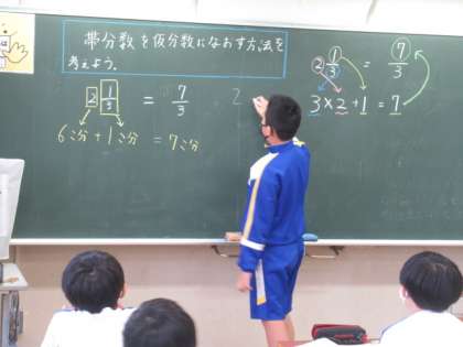 2時間目の算数では、「分数」の学習をしました。今回は、帯分数を仮分数になおす方法を学びました。