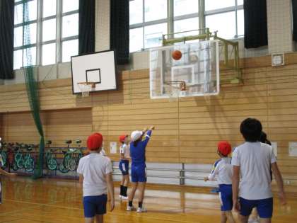 体育では、バスケットボールをしています。試合に勝つために、チームで協力してプレーしています!子供たちが自ら審判をしたり、声をかけたりして、試合に出ていない時間も自分にできることを積極的に取り組んでいます。