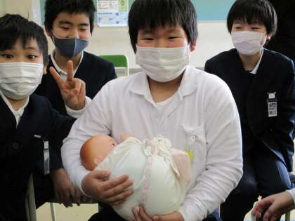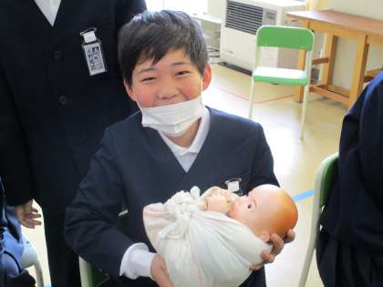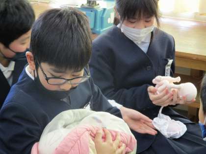 赤ちゃんの人形をだっこすると、自然と優しい眼差しに変わっていきます。