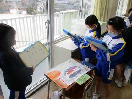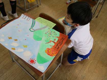 12月になりました。3年生がこれまで描いてきた秋の絵の鑑賞会をしました。友達一人一人の絵をじっくりと見て、すてきなところをたくさん見付けることができました。