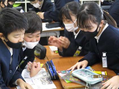 子供たちは、仲間のノートを熱心に見ながら、まとめ方の工夫をたくさん見つけていました。