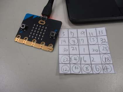 マイクロビットを使って、ビンゴ大会をしました。6年生が作ってきたくれたビンゴカードとランダムに出る数字のプログラムで、どの子も楽しく活動できました。